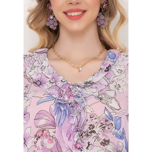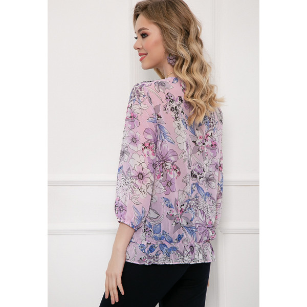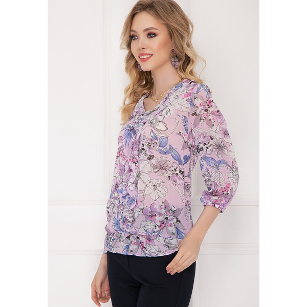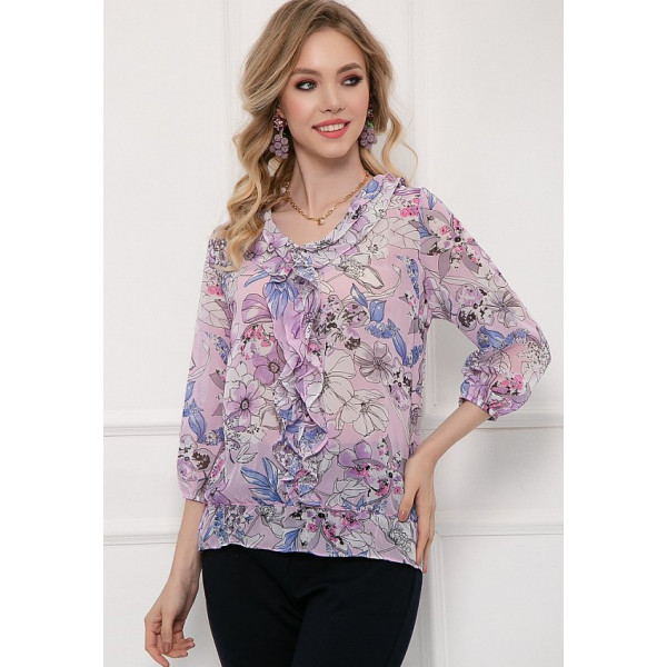 Фриотти - блуза свободного силуэта из шифона с принтом. Вырез горловины V-образный, декорирован двойным воланом. Рукава втачные, 3/4, к низу расширены и собраны на резинке. Заниженная линия талии также собрана на резинку. По низу – волан. Блуза отлично сочетается с различными элементами гардероба: классические брюки, джинсы, юбка. Чувствуйте себя настоящей королевой вместе с “5trend”!