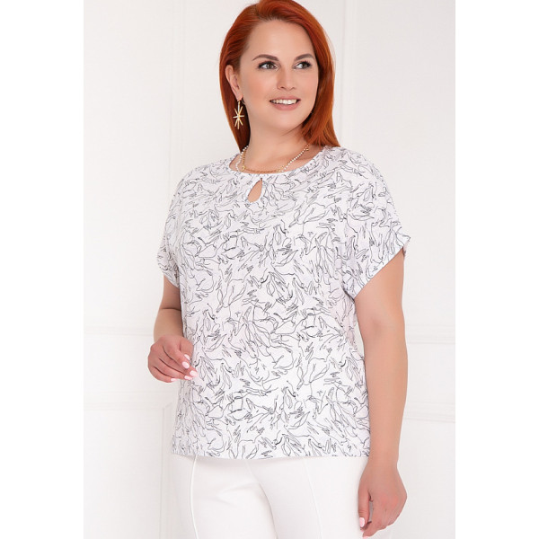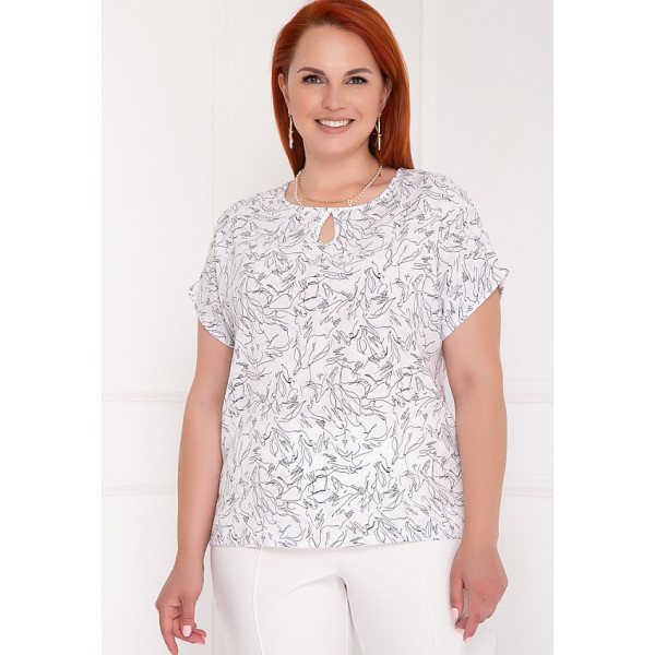 Катута – блуза свободного силуэта, горловина округлая, по переду фигурная “капелька”. Рукав цельнокройный, короткий. Такая блузка отлично подойдет к классическим юбке или брюкам. Будьте привлекательной с “5trend”! Рост модели – 172 см Длина изделия: 46 размер — 62 см 48 размер — 62 см 50 размер — 62 см 52 размер — 63 см 54 размер — 63 см 56 размер — 63 см