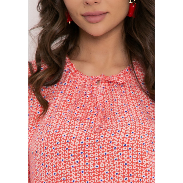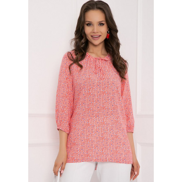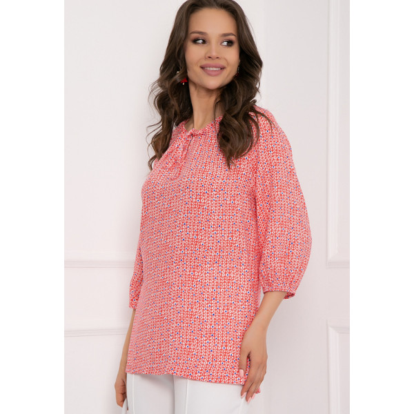 Солчини – блузка свободного кроя из хлопковой ткани с принтом. Вырез горловины классический овальный, декорирован сборками и завязками. Рукав 3/4, втачной, внизу собран на резинке. Блуза отлично сочетается с различными элементами гардероба. Будьте яркой и неповторимой вместе с “5trend”! Рост модели – 172 см Длина изделия: 48 размер — 70 см 50 размер — 70 см 52 размер — 70 см 54 размер — 70 см