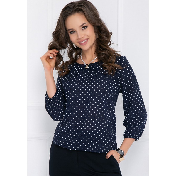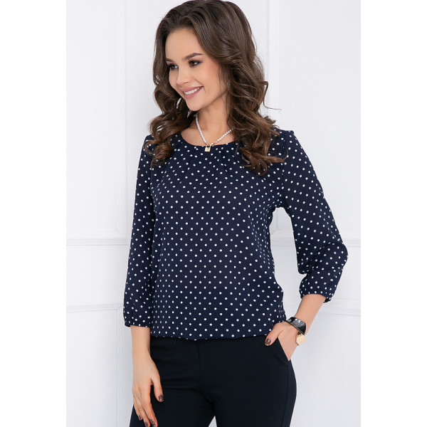 Авалия – блуза в горох из креп-шифона. Округлый вырез, рукава 3/4 свободные на резинке. По низу блузы так же резинка. Меняйся вместе с “5trend”! Рост модели: 172 см Длина изделия: 46 размер — 64 см 48 размер — 66 см 50 размер — 66 см 52 размер — 67 см 54 размер — 67 см 56 размер — 67 см