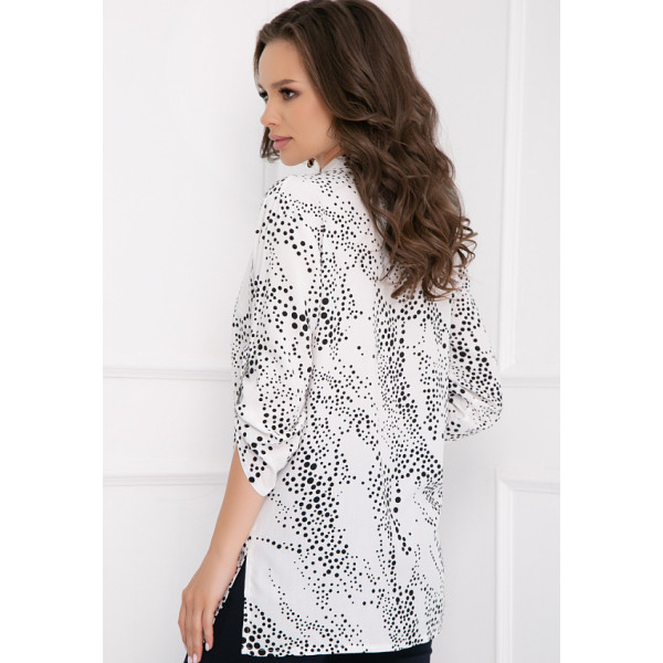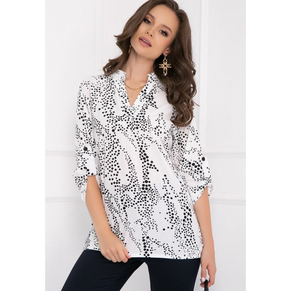 Федерика - блузка свободного силуэта из штапеля с принтом. Вырез горловины V-образный, декорирован планкой. Рукава 3/4, втачные, декорированы функциональной пуговицей. По бокам - декоративные разрезы, придающие образу легкость. Блуза отлично сочетается с различными элементами гардероба. Быть яркой и неповторимой легко вместе с "5trend"!