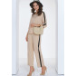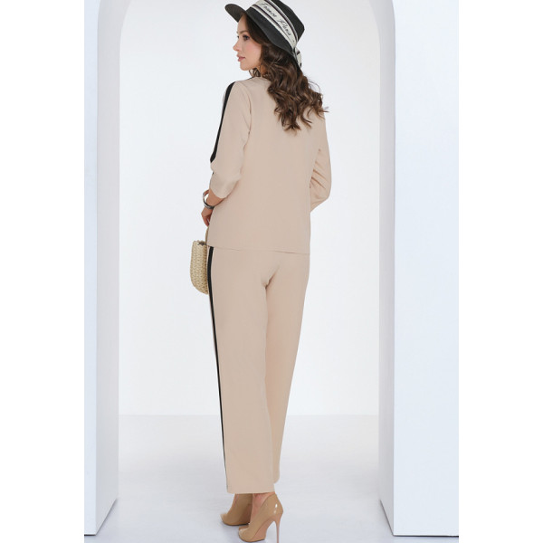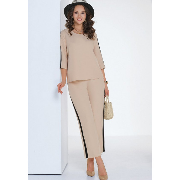 Каренно – стильный костюм-двойка из костюмной ткани. Блузка прямого кроя с рукавами 3/4 и лампасом вдоль плеча. Брюки классические, слегка заужены к низу, декорированы боковыми карманами и лампасами в боковом шве. Будьте неподражаемы вместе с “5trend”!