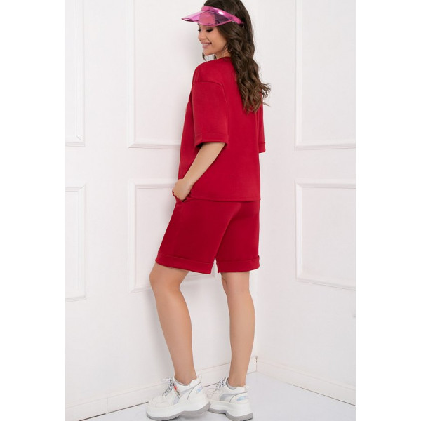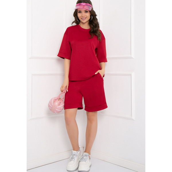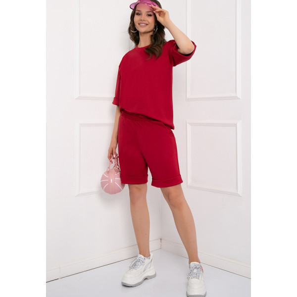Конельяни - женский летний трикотажный костюм, состоящий из шорт и футболки. Комплект выполнен в стиле OVERSIZE. Вырез горловины футболки классический овальный. Рукава короткие, со спущенной линией плеча и подворотами. Шорты на резинке с двумя карманами и подворотами. Будьте стильной и практичной вместе с "5trend"!