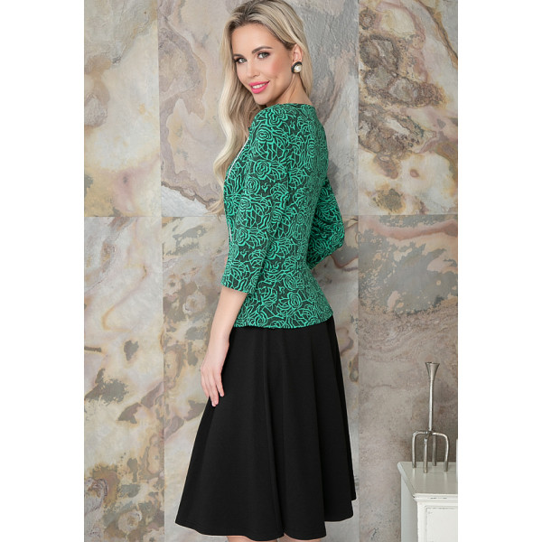 Флавия – элегантное платье с имитацией жакета. Благодаря контрасту: яркий – верх, темный – низ, отлично скрываются недостатки фигуры. Баска визуально создает силуэт “песочные часы”. Кант в рельефе стройнит. А потайная “молния” спереди по середине сделает ваш образ многогранным, так как позволяет с легкостью менять вырез ворота. Будьте загадочной и сексуальной вместе с “5trend”!