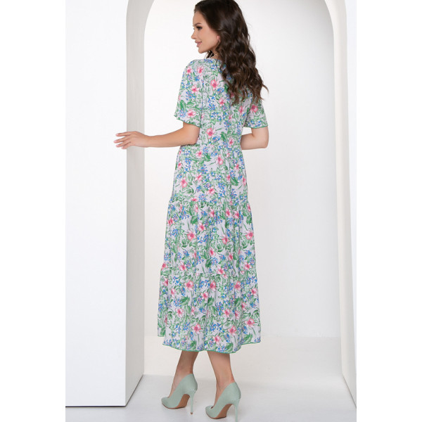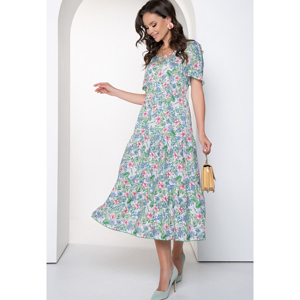 Ламенция - летнее платье свободного силуэта из штапеля с принтом. Горловина круглая, обработана оконтовкой. Рукава втачные, короткие. Юбка средней длинны, состоит из трех воланов. По низу платья и рукавов - закрутка. Будьте яркой и неповторимой вместе с "5trend"!