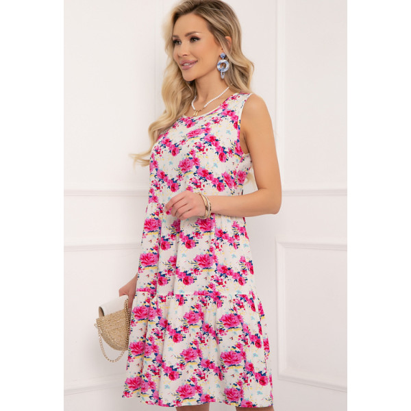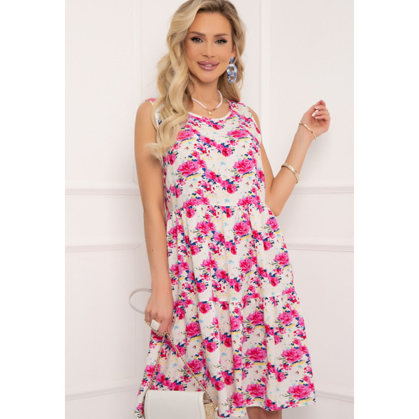 Карлентини - легкое летнее платье А-силуэта из штапеля с принтом. Вырез горловины круглый, обработан окантовкой. Без рукавов. Платье декорировано ярусами, что визуально стройнит и скрывает нежелательные особенности фигуры. Будьте яркой и неповторимой вместе с "5trend"!