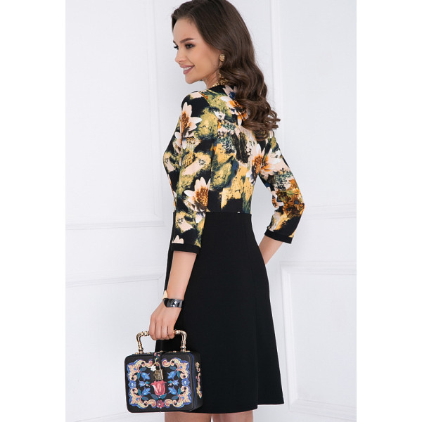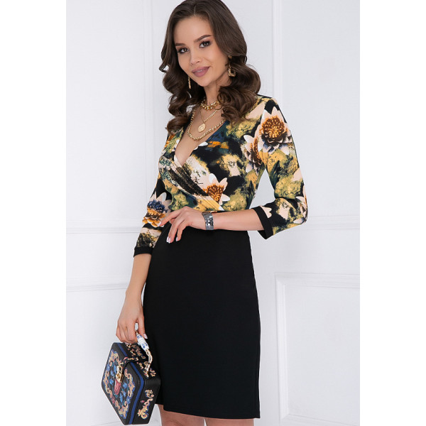 Корсани - утонченное трикотажное платье полуприлегающего силуэта с верхним запахом, отрезанное по талии. Горловина с V-образным вырезом. Рукава втачные, длиной 3/4, завершаются небольшими манжетами. Верх платья выполнен из ткани с ярким принтом, низ - строгий, однотонный. Дополните свой гардероб платьем от “5trend”!