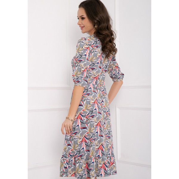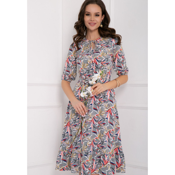Кросани – нарядное платье полуприлегающего силуэта из плательной ткани с принтом. Платье отрезное по талии декорировано оборкой по низу. Рукава 3/4, втачные, оторочены резинкой по краям. Горловина обработана обточкой переходящей в завязки. В комплекте с платьем поставляется пояс. Будьте всегда яркой и неповторимой вместе с “5trend”!