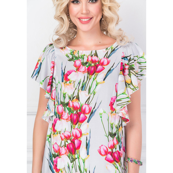 Леричи (фловерс) - платье А-силуэта из принтованного штапеля. Рукава короткие, сверху декорированы воланами, вшитыми в рельефы переда и спинки. Вырез горловины классический "лодочка". Благодаря яркому принту платье отлично скрывает недостатки фигуры. Быть яркой и неотразимой легко с "5trend"!