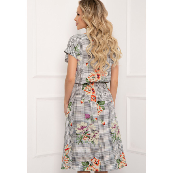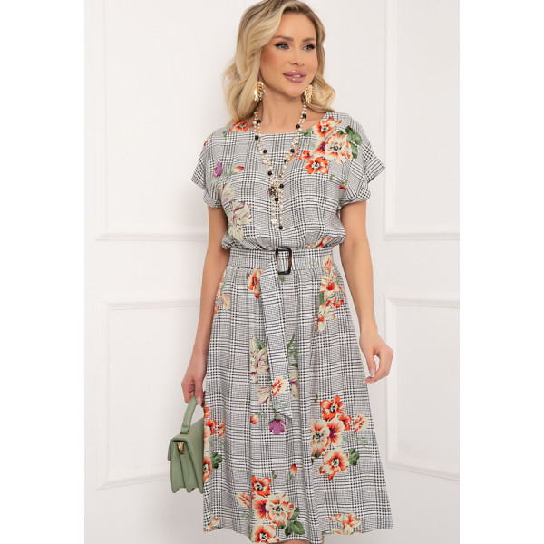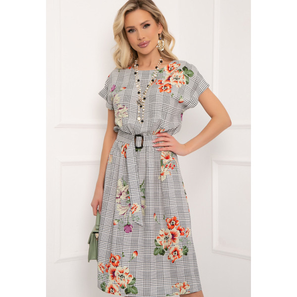 Лилиана - платье свободного кроя из штапеля с принтом. Вырез горловины классический овальный. Рукава короткие, со спущенным плечом. Юбка отрезная по линии талии, оторочена резинкой. В комплекте с платьем поставляется декоративный пояс с пряжкой. Будьте яркой и неповторимой вместе с "5trend"!